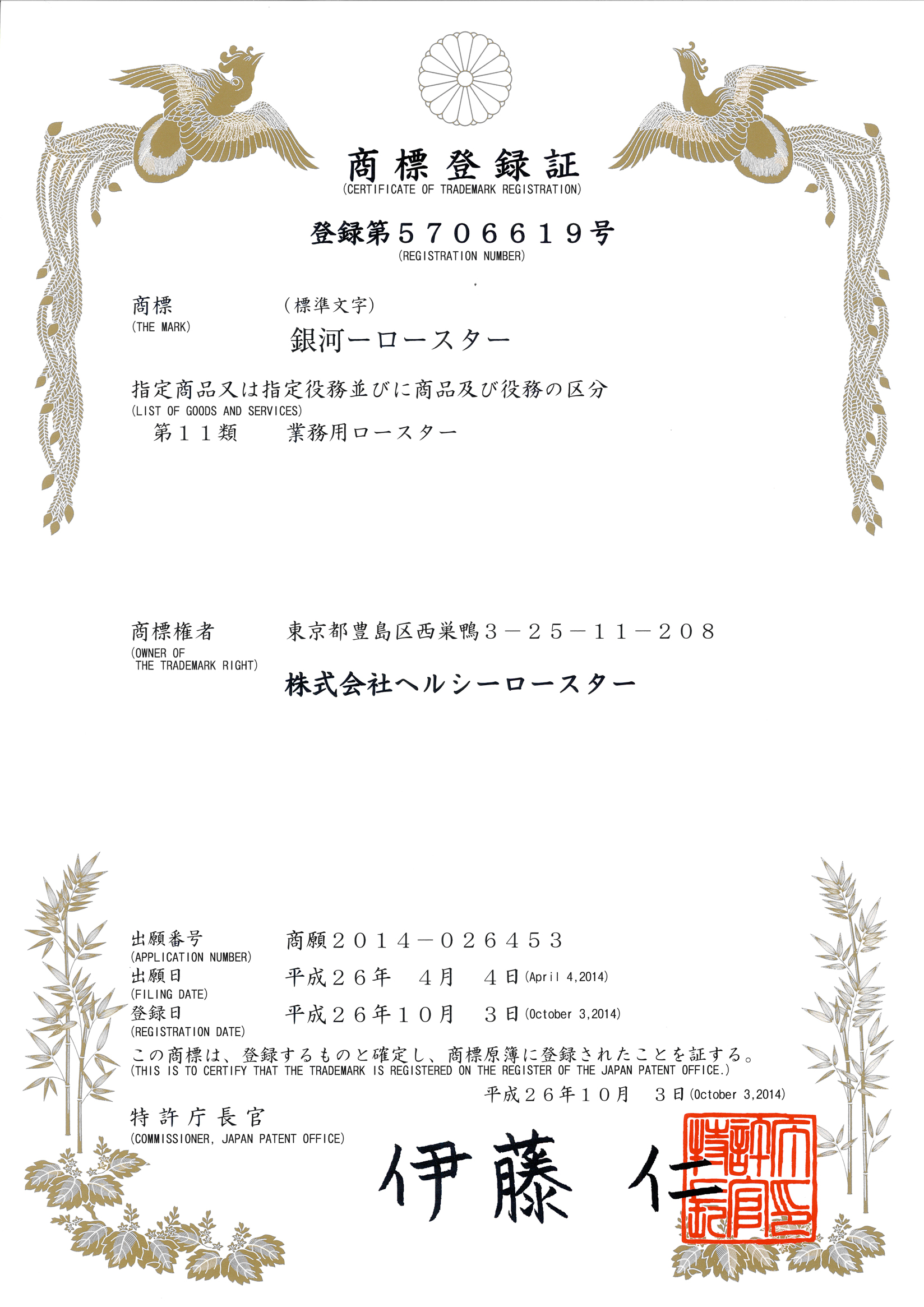 | 10 | [商標登録] 「銀河ロースター」(標準文字 登録5706619号) | |
